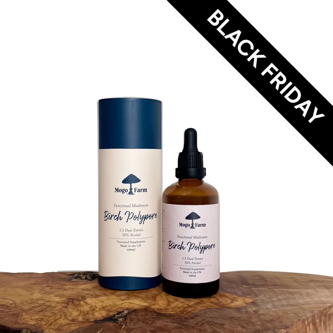 The UK’s only Birch Polypore mushroom tincture - 100ml bottle made from 20,000mg of 100% UK-grown fruiting bodies, expertly foraged, extracted and bottled in Derbyshire using our team’s proven 1:3 dual extraction method.
