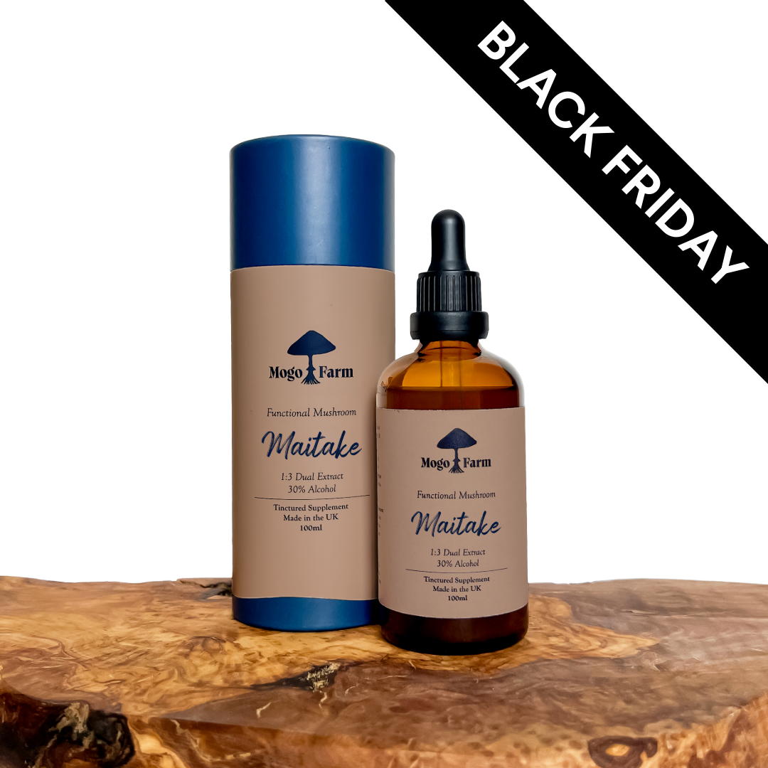 The UK’s most reviewed, highest potency Maitake mushroom tincture - 100ml bottle made from 20,000mg of 100% UK-grown fruiting bodies, expertly cultivated, extracted and bottled in Derbyshire using our team’s proven 1:3 dual extraction method.